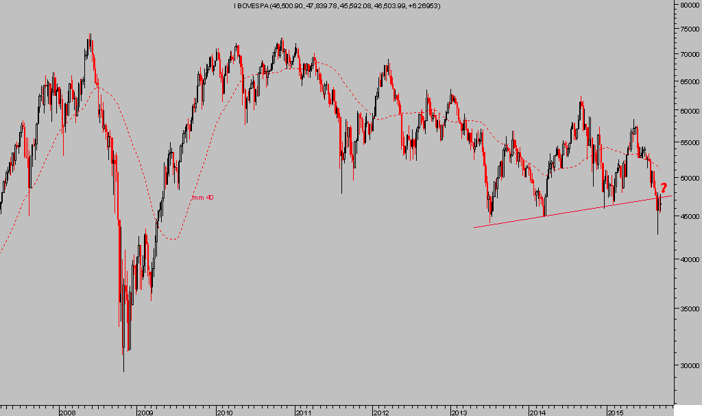 Y ayer Standard & Poor´s rebajó la calificación de la deuda a Brasil, hasta nivel Bono Basura!!! y además ha pasado a perspectiva negativa. El Real Brasileño ha caído hasta niveles de 2002 y el Bovespa o índice de la Bolsa de Sao Paolo cotiza en mínimos desde 2009 tras haber perforado referencias de soporte relevantes