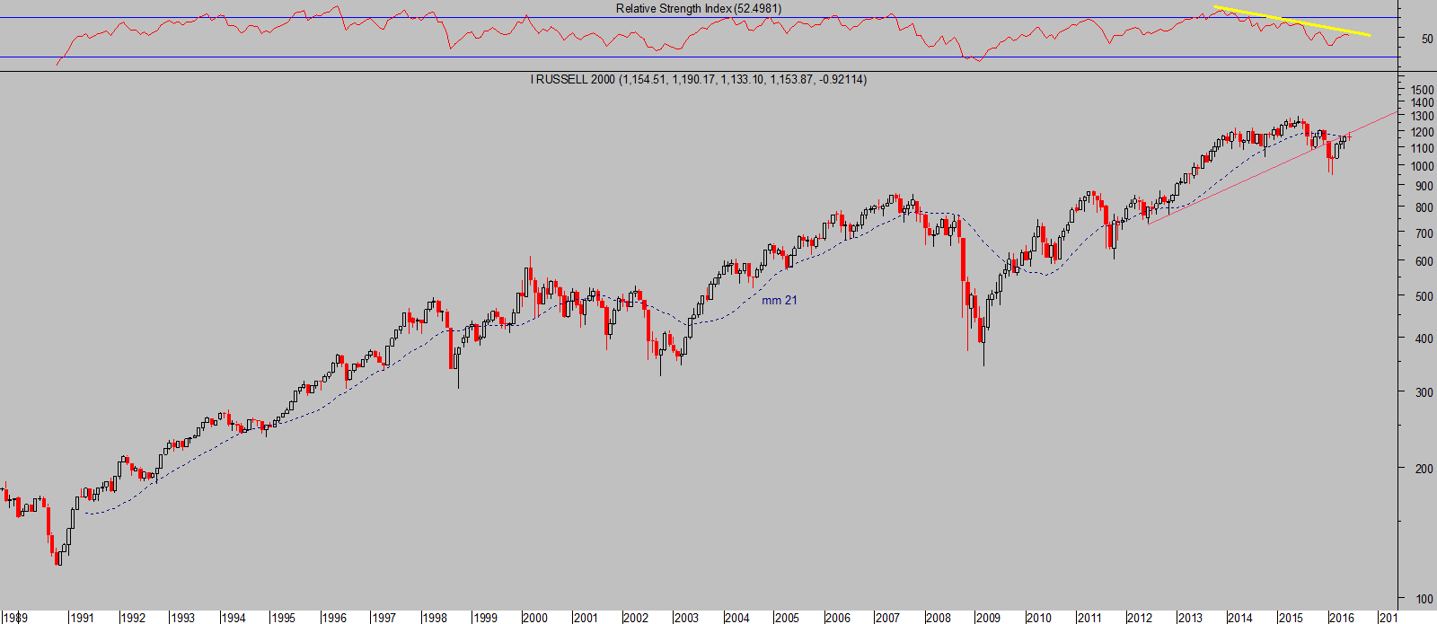 Como ejemplo de la vulnerabilidad del mercado, el índice de empresas de pequeña y mediana capitalización, Russell 2000, cotiza en zona de máximos históricos y con unos ratios de valoración que invitan a la prudencia.