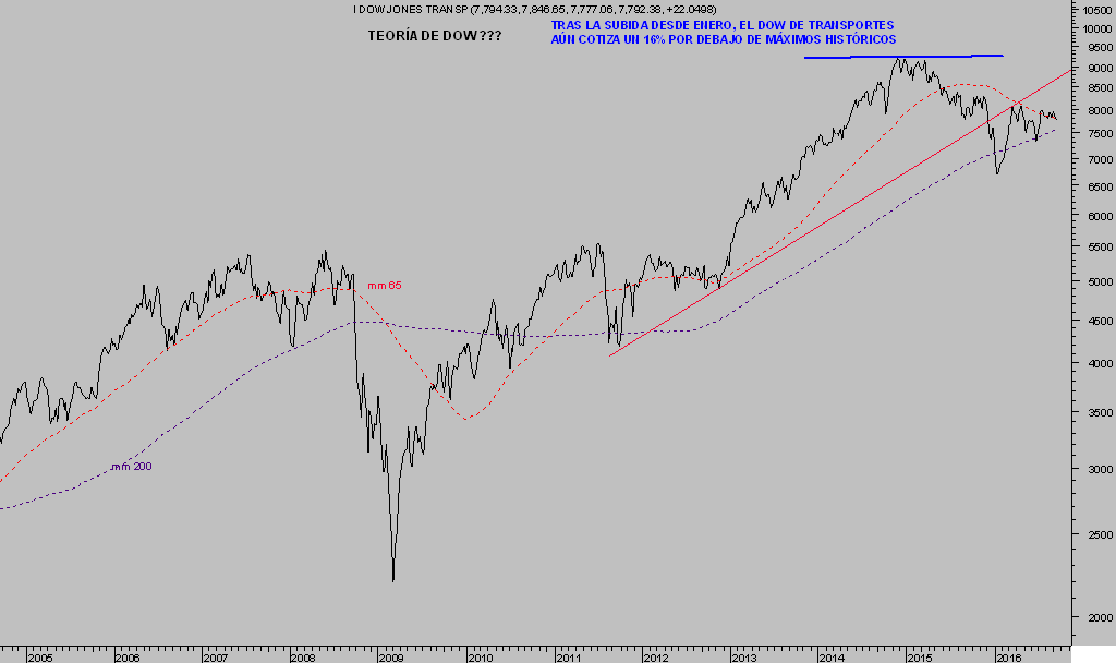 Para terminar, recordamos la posición del mercado según la Teoría de Dow, los grandes índices asaltando zona de máximos históricos mientras que el índice que debería haber liderado las alzas, Dow de Transportes, aún cotiza cerca del 15% por debajo de sus máximos.